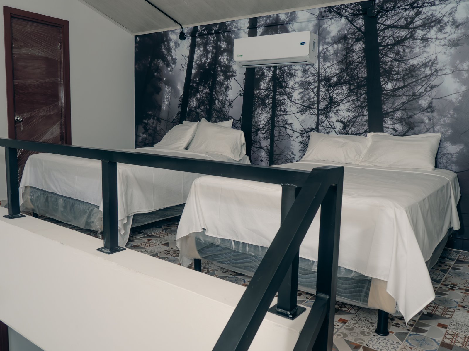 Villa Refugio es una cabaña dúplex de dos niveles, perfecta para familias o grupos que buscan independencia, comodidad y diseño en medio de la montaña. Su arquitectura de ladrillo visto, amplios ventanales y un mural de bosque en blanco y negro crean un ambiente moderno y acogedor.